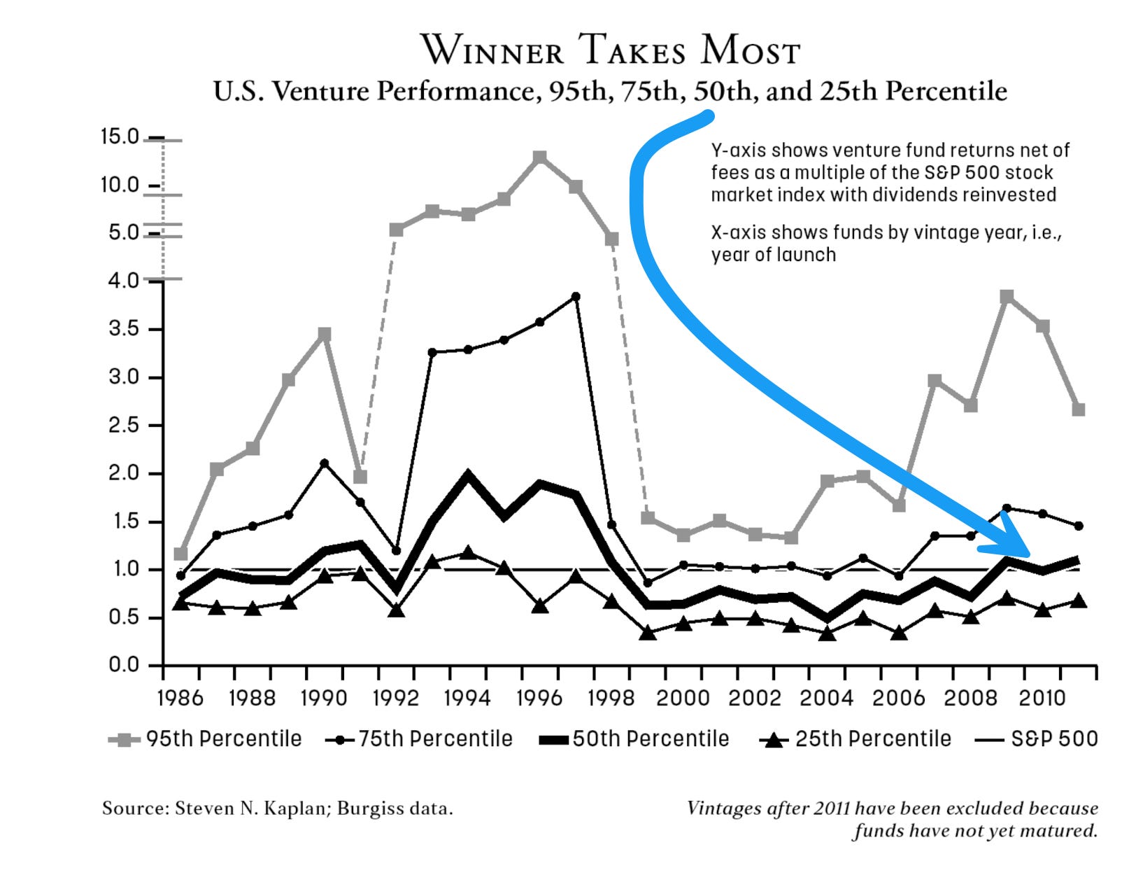 Counting venture funds raised between 1979 and 2018, the median fund narrowly underperformed the stock market index, whereas the top 5 percent of funds trounced it.